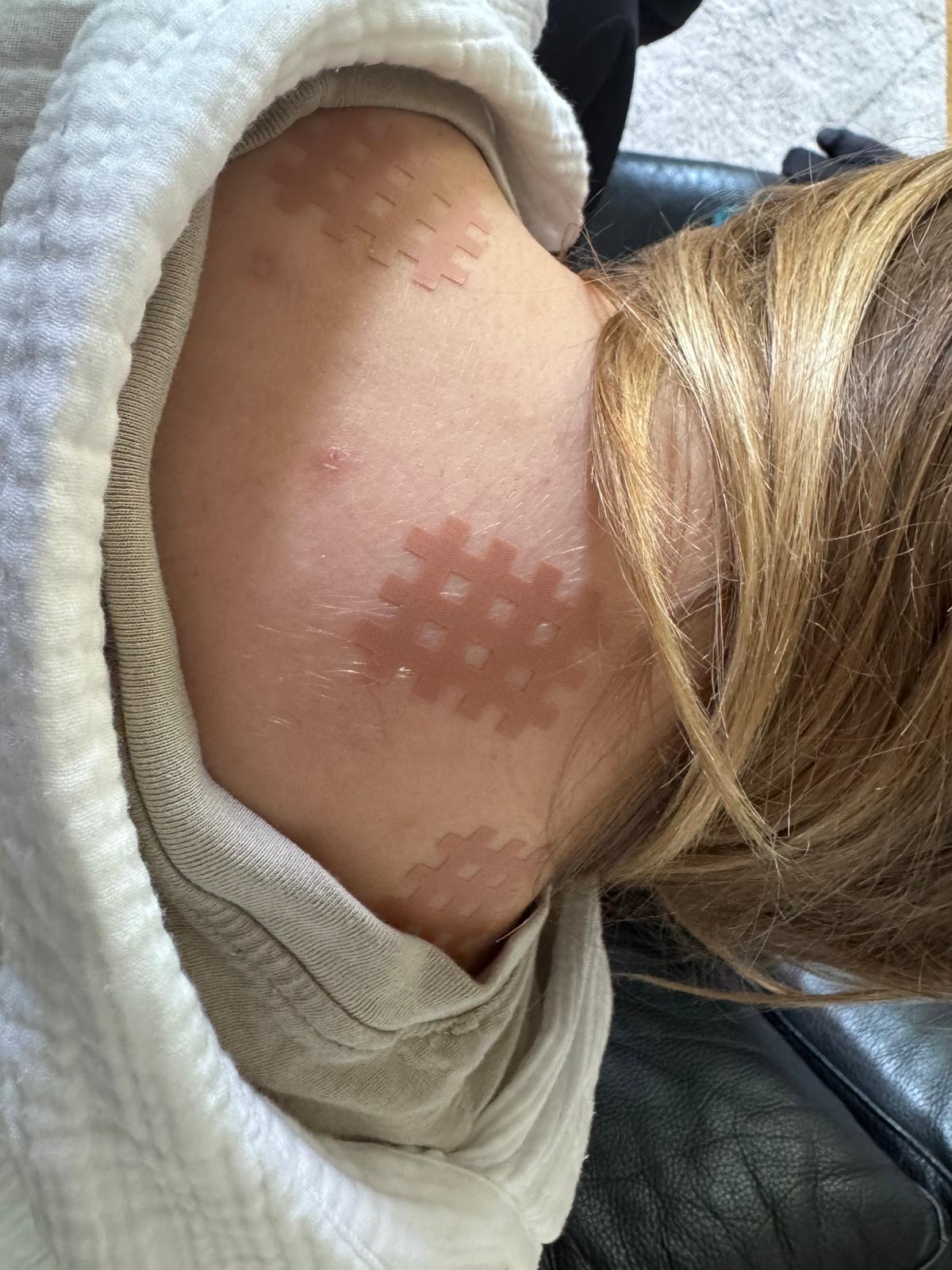 Empfohlen wird die Anlage durch geschulte Personen wie Arzt, Heilpraktiker oder Physiotherapeut. - Vor dem Aufbringen der Gitterpflaster die Haut entfetten.